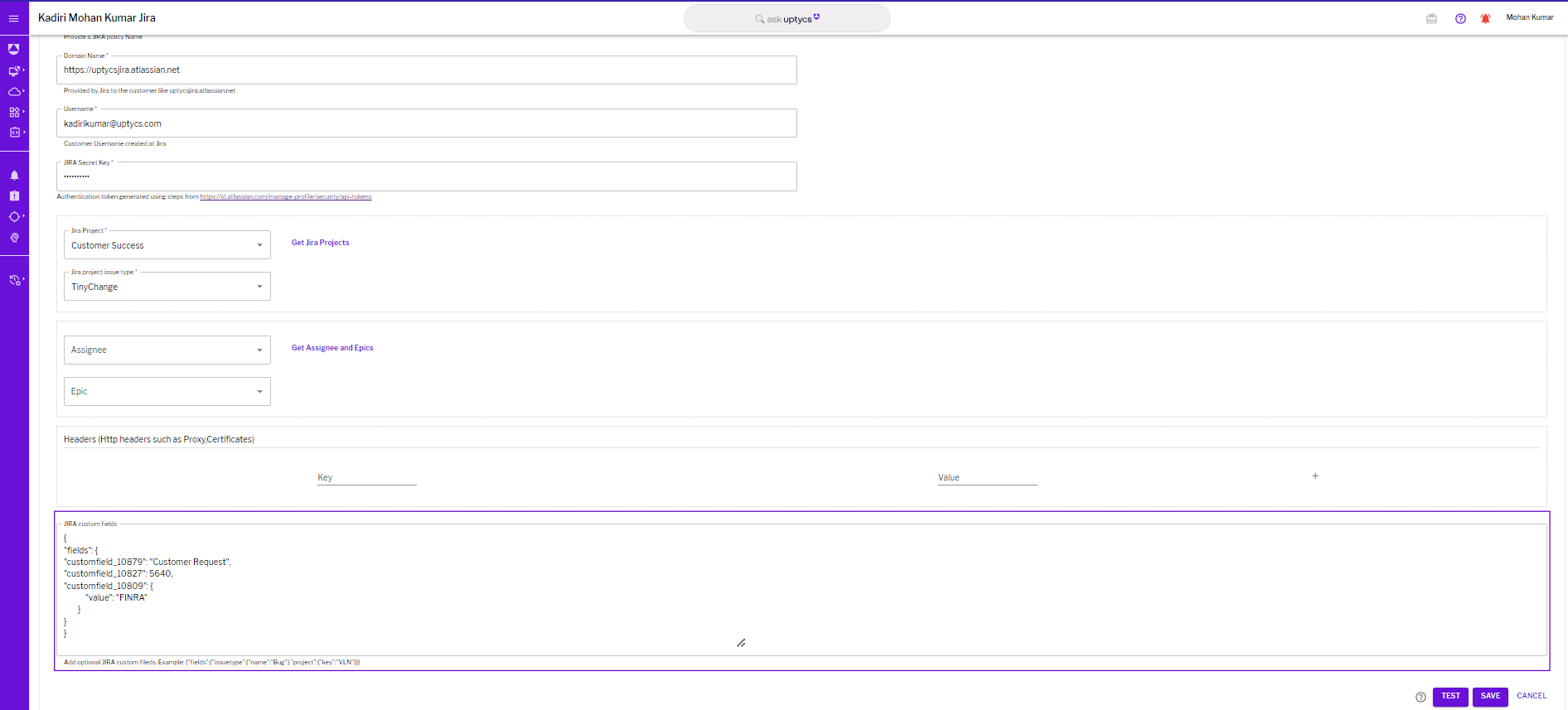 When setting up a Jira destination, the Custom Jira Fields section must be populated with the required custom fields from the linked Jira account in JSON format. These fields are mandatory for the creation of a ticket, even though standard fields like summary, description, and priority are automatically populated by the Uptycs.