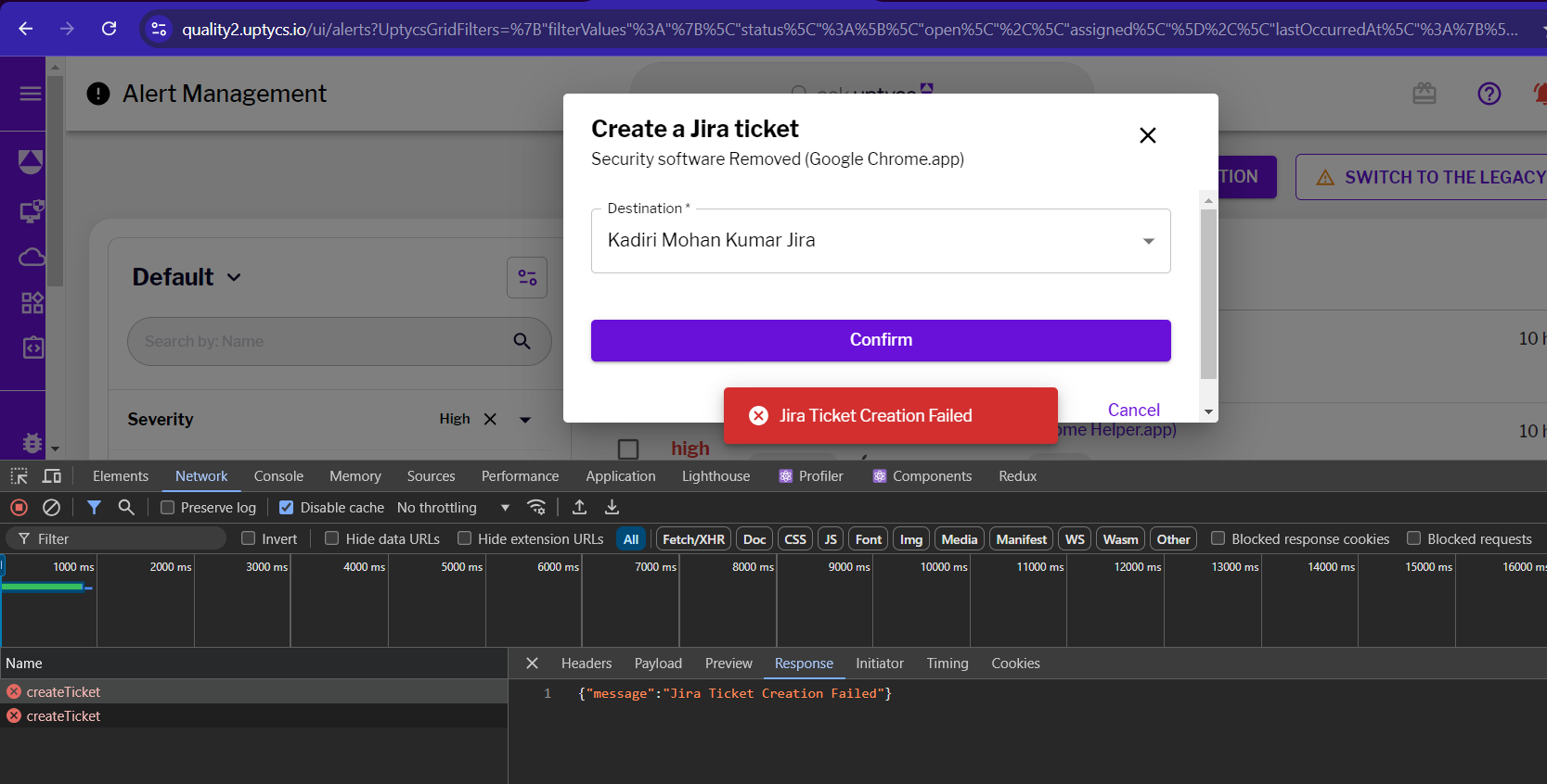 Example of failed ticket creation