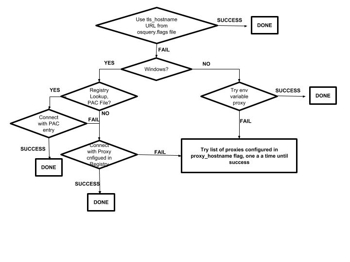 2) If connecting via OS configured proxy fails or if no OS-configured proxy is found, osquery reads the proxy_hostname flag. The flag may contain a single proxy or a list of proxies (separated by a comma but no space). Osquery tries to use the specified proxy or each proxy from the list to test connectivity to the cloud.