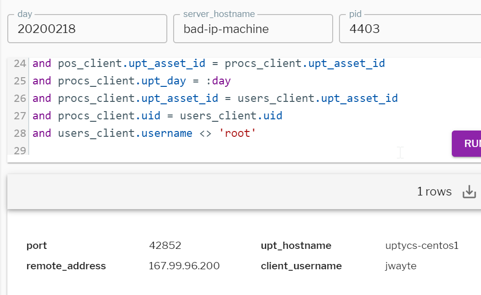 --get the client hostname from the server process_open_sockets.remote_address with client_hostname as ( select distinct ia.upt_hostname as client_hostname from interface_addresses ia, process_open_sockets pos where ia.address = pos.remote_address and pos.remote_address <> '' and pos.upt_hostname = :server_hostname and pos.upt_day = :day and pos.pid = :pid ) --for the server pid, get the remote port and remote_address then join to client machine pos --then join on client to processes then to users to get the username select distinct procs_client.upt_hostname, users_client.username client_username, pos_client.local_port port, pos_client.remote_address from process_open_sockets pos_client, client_hostname ch, process_open_sockets pos_server, processes procs_client, users users_client where pos_client.upt_day = :day and pos_server.upt_day = :day and pos_server.pid = :pid and pos_server.upt_hostname = :server_hostname and pos_server.remote_port = pos_client.local_port and pos_server.remote_port <> 0 and pos_client.upt_hostname = ch.client_hostname and pos_client.pid = procs_client.pid and pos_client.upt_asset_id = procs_client.upt_asset_id and procs_client.upt_day = :day and procs_client.upt_asset_id = users_client.upt_asset_id and procs_client.uid = users_client.uid and users_client.username <> 'root'